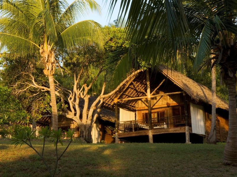There are 7 wood-and-thatch, stilted bungalows spread along the top of the hill with views over the sea to Chole Island.